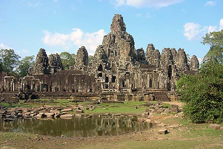 Bayon was the royal temple at the heart of the Angkor Thom royal palace compound. It's probably the second most famous site here after Angkor Wat. It's a large "temple mountain" and is best known for the giant carved stone faces on many of the towers. In addition to tourists and guides, you are likely to find here at least a few budding artists sketching the views and faces.