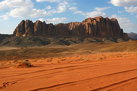 Wadi Rum is a desert in the South of Jordan famous for its red sand dunes, for its granite and sandstone formations, and for being the former base of the operations of T.E. Lawrence (Lawrence of Arabia).