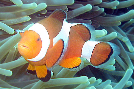 In the shallow area of Rico's Wall you can see anemones with clown fish (in the picture), nudibranchs, and many small tropical fish. In the wall area, you can see lionfish, moray eels and batfish.
