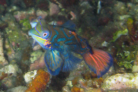 And here you can see a male mandarin fish mating with a female. These colorful fish are small in size (about 2 cm), but their mating dance is something you cannot miss. Mandarin fish go out at dusk, and can be seen almost everyday in Lighthouse Reef. If you want to see them, you will have to do a night dive.