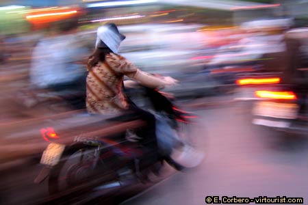 Do not wait for the traffic to stop, it never does. You have to start walking and continue on a steady pace. Motorbikes will avoid you. It takes some practice, but at the end of your stay you will be able to cross the streets without problems. You do have to be careful, because accidents do happen.