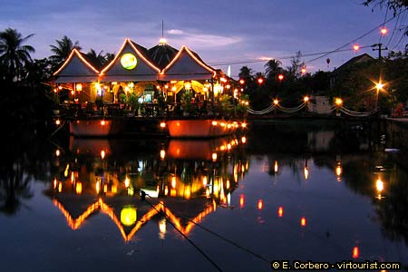In this picture you can see one of my favorite restaurants in town. It is a floating restaurant next to the town's docks. Here you can try the local delicacies. If you are not sure what to order, let the waiter guide you. I recommend ordering different dishes, and sharing them with people on your table.