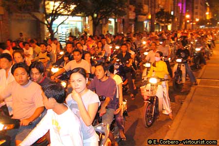 Officially 6 or 7 million people live in Saigon. Half of them own a motorbike. During rush hours, streets and avenues in the center of Saigon are flooded with these small motorbikes.