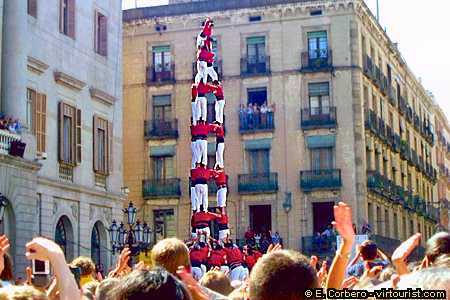 In the photo you can see one of the most traditional "sports" in Catalonia: the 'Castellers'. The construction of these human towers began in the South of Catalonia (close to Tarragona). Currently they are very popular throughout the country. In the picture you can see one of the highest 'castells' (=castle) ever achieved by the local 'colla' (=team). This "tower" is called the 3 of 9, which means the tower is nine levels high with three persons in each level.