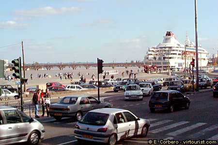 In this photo you see the tourist port of Bordeaux. In the background you can see the 'Pont de Pierrre'. Many tourists come to Bordeaux on a cruise. If you are not so fortunate, you can take one of the boat tours. There are several available. One is a guided tour of the Bordeaux port, from 3 pm to 6 pm. Another tour available is the upstream or down river tour, from 9:30 am to 6 pm. There are also shorter tours. You will find more information at the 'Embarcadère des Quinconces'.