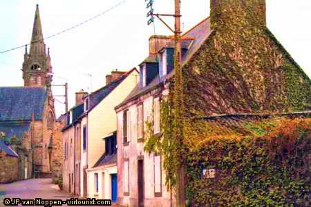 The inside streets are quiet, and not much affected by the tourist trade. Place Saint Thomas, a small square, attracts artists who display their work during the tourist season. The village church is Saint Remi, with its modern version of a Breton steeple. The village life is punctuated by the bells in the tower. While the church looks a bit grey and sad from the outside, the inside sports some beautiful modern stained-glass windows. Breton steeples often have these openings in the stonework, which gives them a characteristic, lace-like look. The aim is not decorative, however, but simply to offer less resistance to the wind. But Bretons are proud of their steeples, and a hymn celebrates "le pays des clochers ajourés" (the land of openwork steeples).