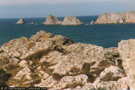 Standing at the top of the Pen Hir cliffs, one can see the Tas de Pois, a string of five granite pyramids, actually the summits of an underwater mountain range, caught in the currents and waves of the Atlantic. In spring and summer, small horizontal platforms on the cliffs may be covered with grass and the occacional tuft of purple heather, but most of the time the cliffs are invaded by seagulls and cormorans building their nests, breeding, and lavishing their guano on the rocky sites.