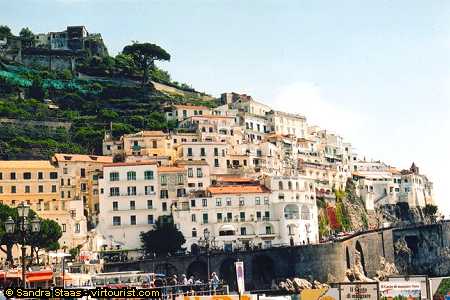 Buses leave every half or so for Amalfi from outside the the railway station in Sorrento. Purchase your tickets at the little shop located just outside the station. The bus ride to Amalfi is spectacular, but beware those of you who have a queasy stomach. Best not to take this bus ride on a full stomach! The road to Amalfi is narrow, windy and very busy. How bus drivers manipulate the sharp curves without hitting one another and without falling off the cliff is mind-boggling. At times it feels as if you are floating on air, that perhaps youve really sprouted wings or are riding a helicopter as the road disappears beneath you and the next curve tantalizes you with its vistas.