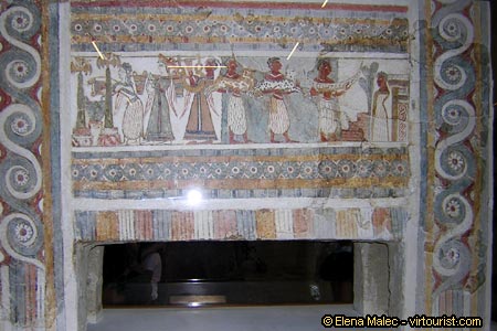 Libation and offerings to the dead. The Agia Triada sarcophagus was found in a looted tomb of the 14th c. BC. It is a burial chest in stone with scenes painted on lime plaster applied over the limestone body of the chest. The scenes depicted on the sarcophagus are unique in Aegean funerary art, and gave way to an array of speculative interpretations, since written information on Minoan cult practices and religion is not available yet.
