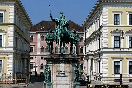 Along Ludwigstrasse you will find a series of buildings that house the Ludwig-Maximilians-Universität, the Bavarian State Library and many state ministries. In the picture you can see a monument dedicated to the Bavarian King.