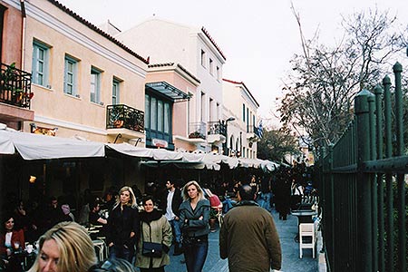 There are a number of vibrant neighborhoods full of cafes, shops, street performers, etc., most notably the tourist havens of Plaka and Monastriki, seen here. And what better place to sit outside a caf‚ than in the shadow of the Acropolis! Well, that concludes our tour. I hope you enjoyed it.