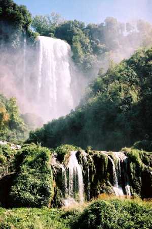 Not too far from Narni, the Marmore Cascades are artificial waterfalls built by the Romans as part of larger waterworks. Water is here spectacularly deviated into the valley in three successive steps. Today, the falls have given rise to the building of a considerable tourist infrastructure, complete with shops, restaurants, a covered gallery from which the falls can be watched, and a shuttle bus taking visitors up and down along the path allowing a variety of perspectives on the falling water.