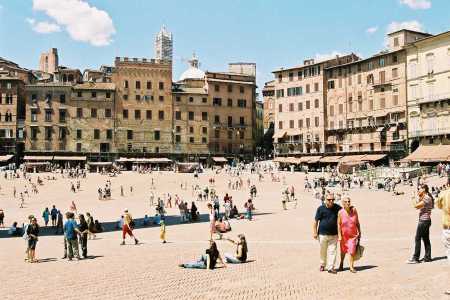The Piazza del Campo is a fan-shaped place divided into eight sectors symbolizing the nine families which constituted the government in the prosperous heyday of the republic. In its upper part stands the Fonte Gaia (see picture 41). Twice a year, the Piazza is the scene of the Palio festival, a colourful spectacle during which the various Contrades or quarters and parishes of the city parade around the square in medieval costumes, waving their flags and banners, and ending with a short, fast cavalcade (on unsaddled horses) around the square.
