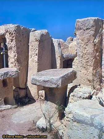 Hagar Qim was a place of worship and its oracular rooms are a typical feature of the Maltese Megalithic sanctuaries revealing complicated religious rites performed with sacrificial animals. Here is a stone altar standing under the elements at Hagar Qim.