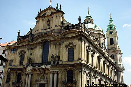 The Church of Saint Nicholas (Chrám sv. Mikuláse) was constructed in the 18th century, and its the masterpiece of the Baroque Prague architects: k. Dientzenhofer and his son. Inside its dome there are some interesting Baroque frescoes, among the biggest in Europe. W. A. Mozart played the organ of this Church during his stay in Prague. Concerts are held regularly in the temple nowadays.
