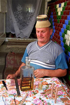 Wearing a typical Maramures hat the miller Gheorghe Opris invites us for to a glass of "Horinca" or plum brandy and tells us about his sons and his passion of making little ladders out of plum wood and inserting them, like model ships, into bottles of plum brandy.