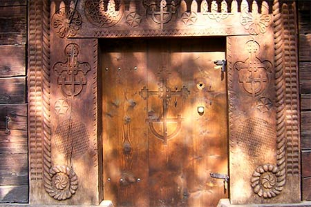 Displaying the features of local art from Maramures on the wooden portal of the church in Budesti-Josani are carved ancient solar symbols, rosettes, Christian crosses and the relief rope which is considered by specialists to represent the snake as a protector of the sacred room. It's about time to discuss what would the church represent for traditional communities. Churches have always been the place where people gathered for prayers, and also the place where the village wise men were meeting to make decisions in hard times. From the church tower enemies could be watched, and the church bell would warn people about fires, floods or other misfortunes coming upon the village. The dead were buried around the church according to hierarchies settled by customs; the church preserved the holy books, manuscripts, icons of great spiritual and artistic value, battle flags, bride grooms crowns and heroes crowns. It was in the church where babies were baptized and weddings were performed, mourning and other rituals were carried out. Some Maramures villages have two parishes with the respective church which is identified by the location within the village, the upper-dwellers or Susani in Romanian and the lower-dwellers called Josani as in the case of the village of Budesti which has two parishes and two churches, this one being located in the lower part, that's why it is called Budesti-Josani.