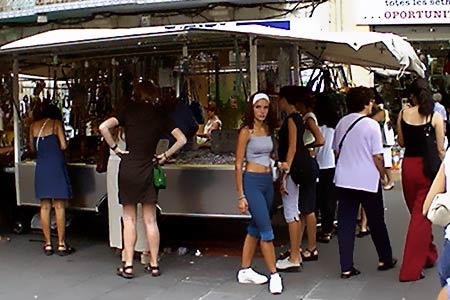 We are now in a street market in the Corsini square. On this stand they sell handbags, handkerchiefs and many other things. As you can also see here, some of the most beautiful monuments in Tarragona are not that old ... (Yes, I am talking about the girl)