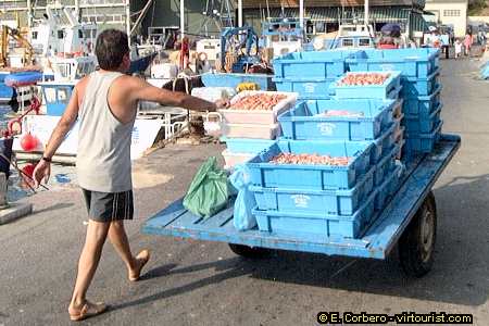 Let's follow this fisherman. He will take us to the fish market. The market opens its doors every day around 6 PM. Only local fishermen can get in the market. Visitors can see all the action from a second floor platform. Following the signs we will get to this observation point.