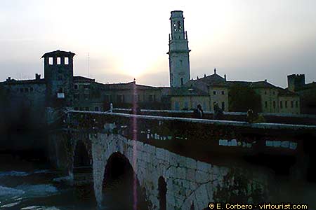 This stone bridge dates from the Roman Empire times (Augustus). The bridge has been reconstructed several times. The first time was in 1298 when the archs that are closer to us were reconstructed by Alberto della Scala. The bridge was almost completely destroyed in 1945 in the second World War, but was perfectly reconstructed (with its original stones) soon after.