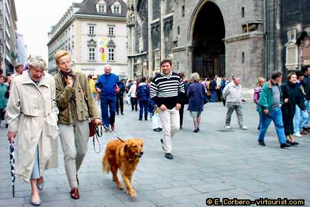 Well, actually not the facade, but the square in front of the church. This is a very busy street in Vienna. In front of us theres the Roten Turm street and at our back Kärtner Strasse, two commercial streets in town, with many shops and restaurants. The tourist information center is at the end of Kärtner Strasse, in front of the Opera House (weve been there, remember?).