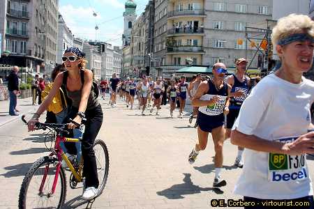 To get to the Hundertwasser Haus, we have to take the underground and get off in Wien Mitte, from where well walk for a few minutes. As you can see in the photo, theres a sport event taking place right now. Its the Vienna Marathon, one of the most famous in Europe. They are close to the Finish line, so its not surprising that they look tired.